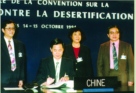 1994年10月,祝光耀代表中国政府签署联合国防治荒漠化公约(法国巴黎)