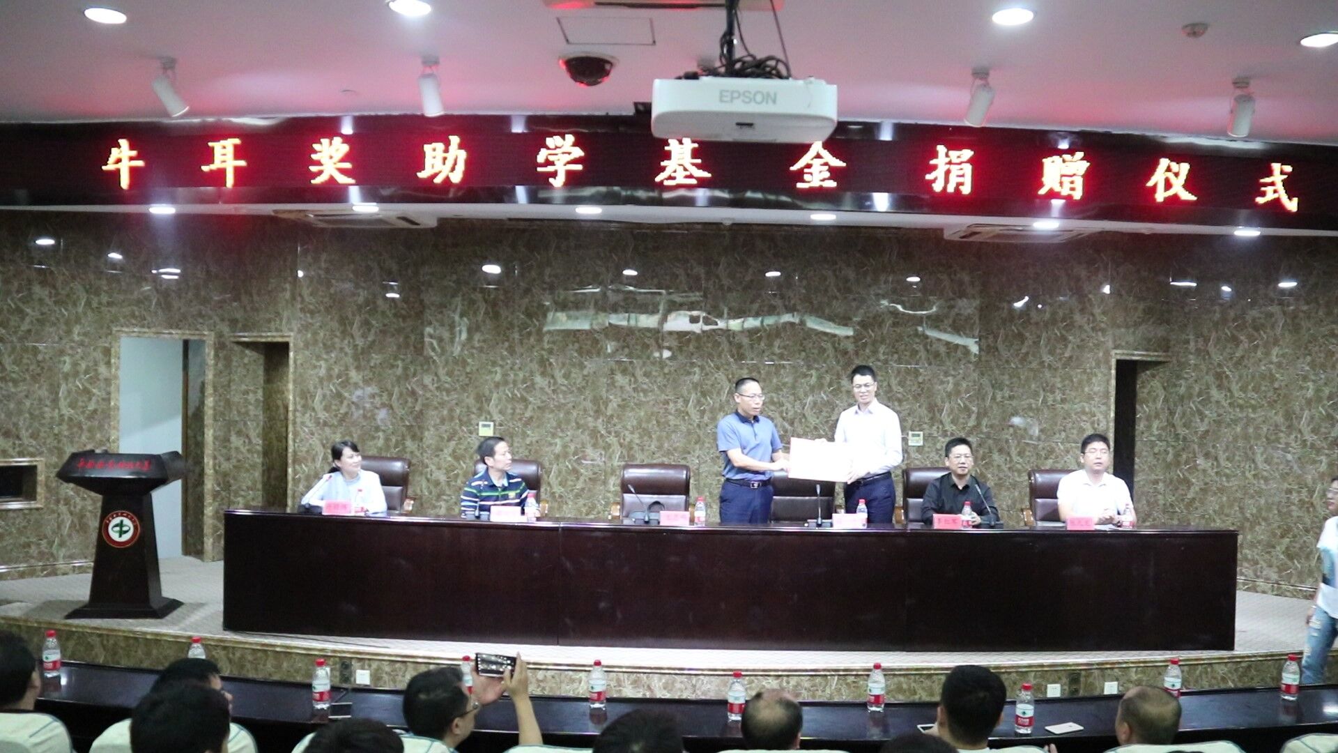 胡平表示在学校60周年华诞、计信学院成立25周年以及公司与学院合作10周年之际,公司向学校捐赠5万元设立“牛耳奖助学基金”,用于奖励、资助品学兼优的计信学子。“我们捐出去的只是一份心意,但是体现的是企业对社会的一种责任,更是对教育事业的情怀”他说道“虽然奖助学金不能完全解决同学们所有的困难,但是却能给深处逆境中的同学们雪中送炭,给优秀的同学们以奋进的目标,更能弘扬中华民族的传统美德。”